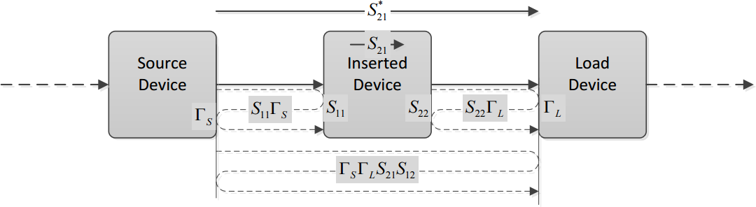 The above examples has considered two adjacent port s only. When a device is inserted in the system chain between two reflective devices, one can intuitively identify several interactive reflection terms at play as depicted in Figure 2. The S21 parameter and associated S-parameters of the DUT are measured by VNA. Their magnitudes, as well as magnitudes of ΓS and ΓL are readily obtained from data sheets of the devices involved.